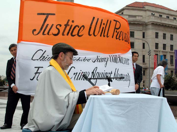 | 在华盛顿DC自由广场上上演在道德法庭公审江××的布偶戏 | 道德法庭法官宣布江××有罪 |
