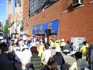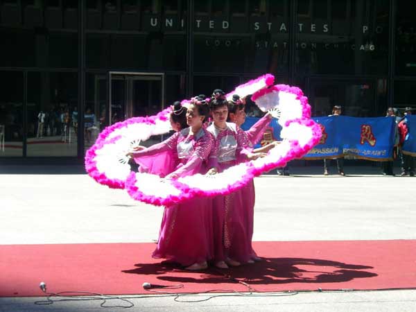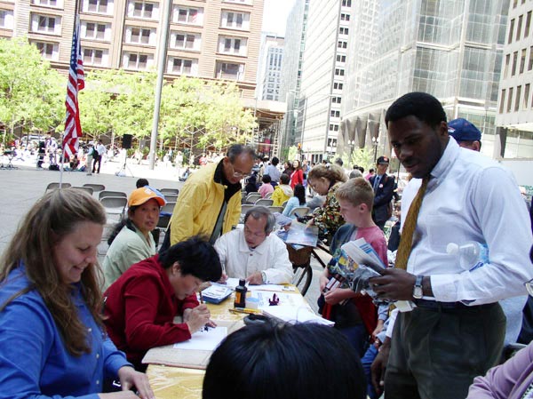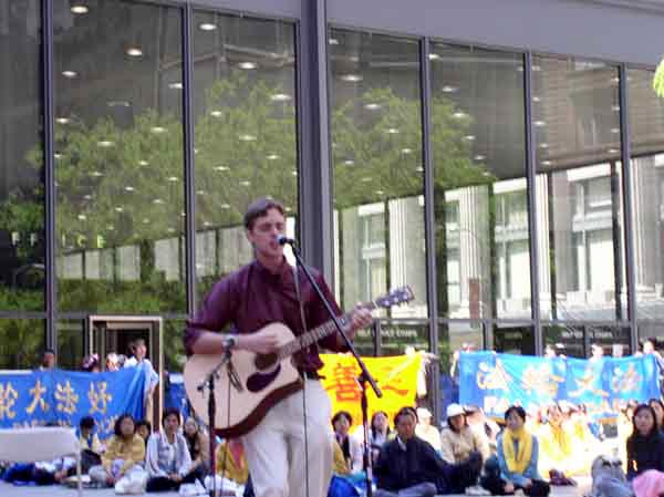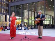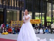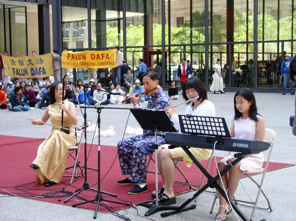 一位年轻人说,他非常敬佩法轮功学员的精神,把如此美好的东西奉献给社区。他还感谢学员们把在中国迫害法轮功的消息传播到美国社会,使更多人知道这场可怕的迫害。一位男士听完二胡演奏后,连声称赞“真是令人惊叹,真是令人惊叹!”,并说希望我们的活动能够对停止在中国的镇压有所帮助。当DC学员身着典雅华丽的唐装表演功法时,发资料的学员趁机给纷纷驻足的路人介绍功法。人们纷纷索取资料,有人说他有3位中国朋友,他要给他们也拿一些资料。一对夫妇跟学员长时间交谈,学员讲述了诉江案、美国公民查尔斯李在中国被非法关押,以及江氏集团将迫害延伸到海外等,他们对迫害感到震惊和愤慨。夫妇俩同时又为学员们优雅平和的功法演示所吸引,准备找炼功点开始学功。一位学员说看到那么多善良的人高兴地拿到真相资料,她的眼中噙满泪水。值得一提的是,一位湖南来的老大爷一直在看我们的表演。开始学员问,他摇着手,避之不及。但观看了一会表演之后,学员又徐徐地给他正面介绍大法,告诉他法轮功真善忍的信仰,是教人作好人的。配合着柔和的音乐,老大爷听得连连点头。
