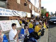 其中有一些年逾花甲的老人,他们也是乘长途车通宵赶往这里。人们安静地炼习法轮功五套功法,向人们展示法轮功学员不屈服的毅力。中国驻芝加哥领事馆前面和左右的街巷道周围坐满了法轮功学员。领馆的正对门,挂着巨幅海报,上面是四年来被无辜虐死的一些中国法轮功学员的照片。法轮功学员打出巨幅“全球公审江泽民”、“把江泽民送上法庭”、“停止镇压法轮功”等巨幅横幅,场面壮观肃穆,芝加哥市民说:“这样的场面,近百年都不曾看见。”法轮功学员给芝加哥市民派发了大量传单,芝加哥的气氛和焦点话题都在谈论“起诉江泽民”。