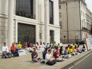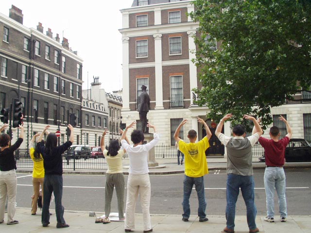 来自英格兰的部分大法弟子,在中使馆前和平炼功、每个整点发正念,并向过往的行人讲真相。