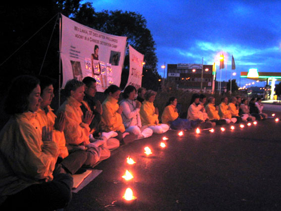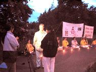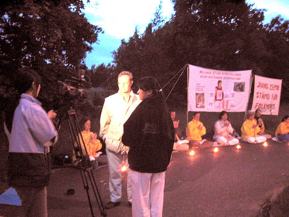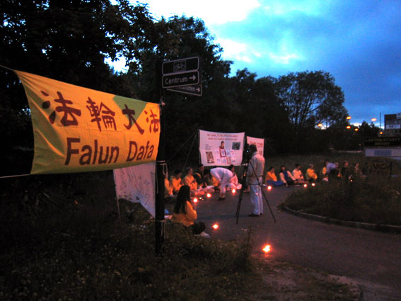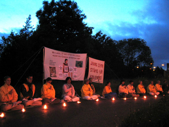 【明慧网2003年6月24日】2003年6月21日,瑞典法轮功学员在中国领事馆前举行了烛光守夜,支持伊利诺伊州控告江泽民群体灭绝罪、反人类罪和