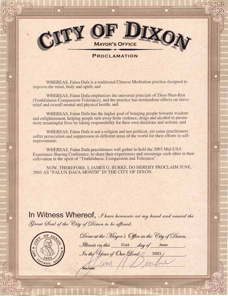 至此,我,杰姆斯 G. 伯克,在此宣布2003年6月为迪克森市“法轮大法月”。