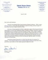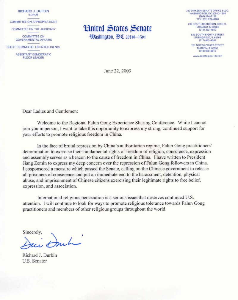 面对中国独裁政权的残酷镇压,法轮功修炼者行使其基本宗教信仰自由、良心自由和集会自由的决心如同中国自由里程上的灯塔。我已写信给[前]国家主席江××以表达我对中国镇压法轮功修炼者的深度关注。我与他人共同提出了一项措施并在参议院获得通过,呼吁中国政府释放所有良心犯,并立即结束骚扰、拘留、虐待和囚禁行使信仰、言论和结社自由等合法权利的中国公民。