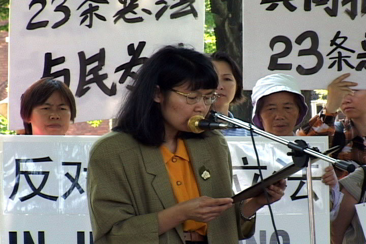 全球反23条立法联盟的代表Cindy Chen小姐在集会上发言说,香港政府以为香港未来考虑的名义强行将23条立法,说“23条立法不会针对任何个人或组织”;如果真是这样的话,香港人应该欢呼这条法律的颁布,那怎么会有成千上万的香港人集会、游行反对这项立法呢?说到底,23条立法不是保护人民的,相反是套在港人脖子上、限制港人自由的枷锁。她指出:“围绕23条立法正在进行着一场正与邪的较量。支持立法的一方是非民选的香港特首,而反对立法的一方则是包括香港传媒、人权活动家、商人、‘香港的良心’陈方安生、天主教堂的任主教等在内的香港选民和全世界众多的善良民众。”她还指出:“23条立法的后果将影响香港600万民众的未来,也是对人类良知与正义的挑战。”“世界希望通过香港来影响中国大陆,使之最终走向民主与繁荣;因此,我们决不允许最后这片自由的土地丧失自由。”