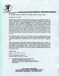 尽管贵使馆做出了这些企图,加拿大学生联合会魁北克分会再次重申我们的立场:我们反对针对任何团体的人权侵犯,并谴责中国政府对法轮功学员的迫害。我们敦促中国大使馆以及其他组织或代表听取和考虑我们和其他地方分会的关注,作出理性的答复,并停止向我们散发否认确凿真相的诬陷材料。