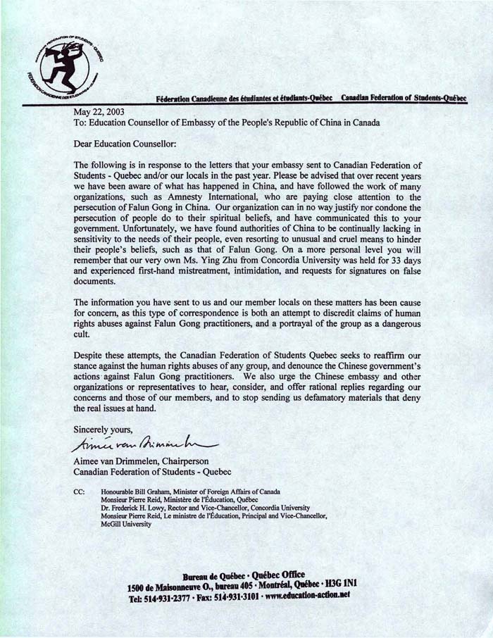 此封信是对过去一年来贵使馆给加拿大学生联合会魁北克分会以及/或者其他地方分会来信的回应。近几年来,我们已经得知了在中国所发生的事情,并追踪了许多组织的工作,包括一直密切关注中国迫害法轮功的大赦国际。本会无法认同或宽恕仅因他人的信仰就对其迫害的行径,并已向贵政府表达了这一观点。遗憾的是,我们发现中国当局继续无视中国人民的诉求,甚至采用极端和残酷的手段阻挠他们个人的信仰,如信仰法轮功。从个人角度而言,您将记得,就在我们中的康科迪亚大学的朱颖女士被监禁了33天,亲身经历了虐待和恐吓,还被强令在假文件上签名。