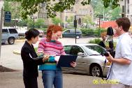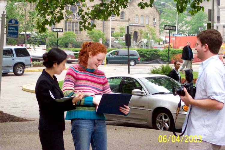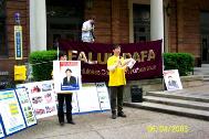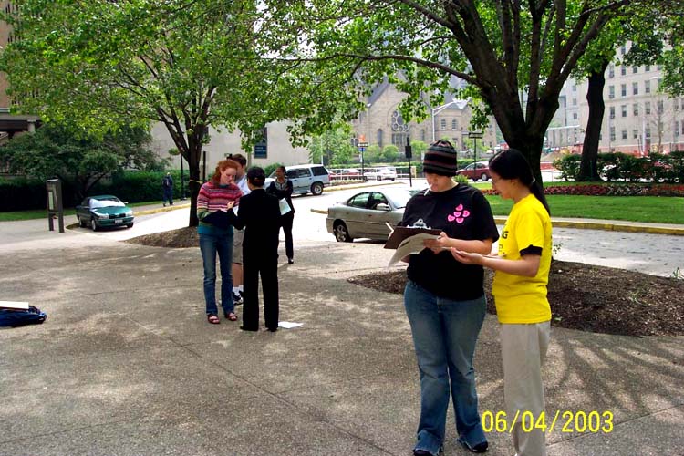 就在大家安安静静地发正念时,一位校报女记者碰巧路过我们的新闻发布会现场,她注意到了我们的法轮大法横幅。该记者对发资料的学员说,大约两年前,她从华尔街时报的报导中得知陈子秀女士因不愿放弃修炼法轮大法而被酷刑致死的消息而深感震动。她觉得所有的政府都应该站起来制止这种暴行。她告诉我们,她早就有报导法轮大法的愿望,苦于以前没有机会。发资料的学员告诉她,我们马上有新闻发布会,欢迎她参加。女记者非常高兴,很快叫来一位校报摄影记者为我们拍照。