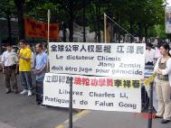 法国法轮功学员中使馆前支持全球公审江××(图)