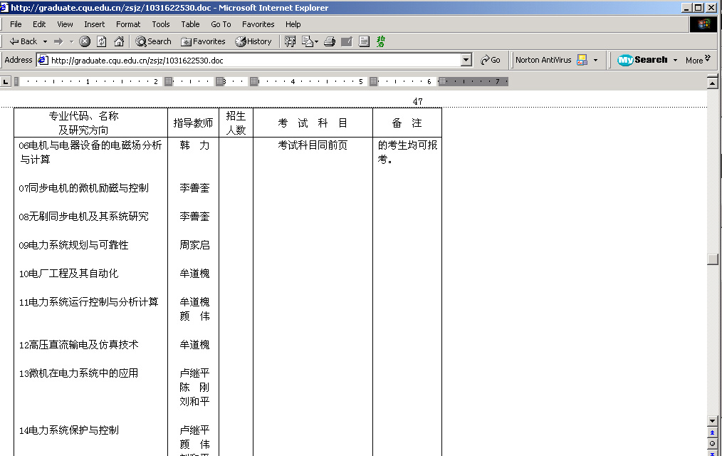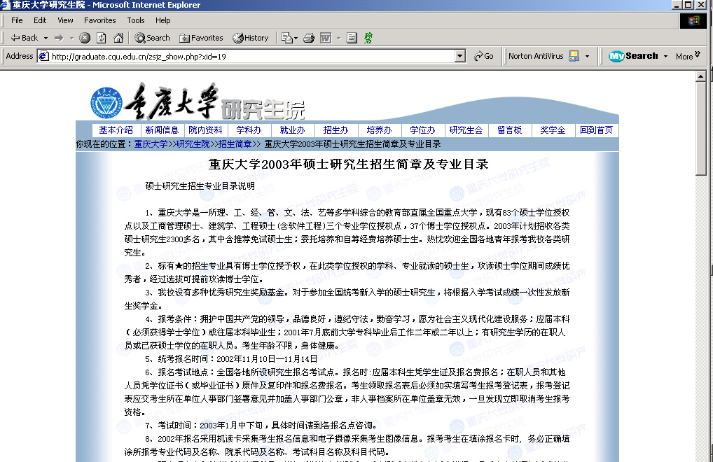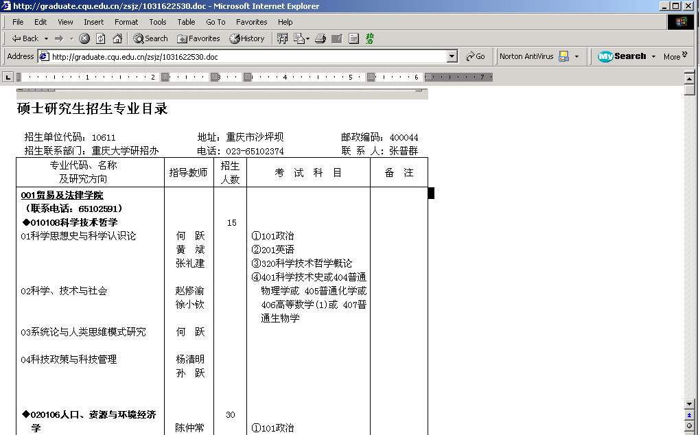 7. 功夫不负有心人啊,弄虚做假总会露出马脚。魏星艳既然是研究生,我就在学校首页右上角,找到“研究生院”,进入,点击“招生办”,“招生简章”出来了。真是妙!大家知道,“招生简章”是最详细了。看到“重庆大学2003年硕士研究生招生简章及专业目录”(注5),赶快进入,可惜没有想象当中那长长的列表,顶多就一两页。啊哈,在最后一行写有“详细内容请在WORD文档下载。”(注6) 原来是这样,赶快下载。