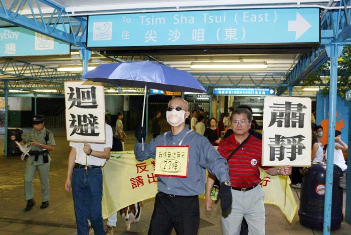 另外,民主党在天星码头的一百小时绝食反二十三条行动进入尾声,绝食人士仍精神奕奕,志气昂扬。昨天的特备节目是「无法无天23条」官差出巡,一名剃光头男士手持雨伞,颈上挂上写着「我系无法无天23条」的牌子,两旁分别有两人持「肃静」、「回避」的大牌子,“凶恶地”在行人道上横行。