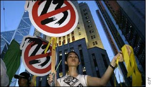 香港媒体报导说,在香港市中心中环立法会外,以及附近的遮打花园和皇后像广场有不少参加集会者聚集,他们挥动荧光棒,而且高呼口号,要求特区行政长官董建华下台。