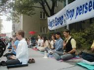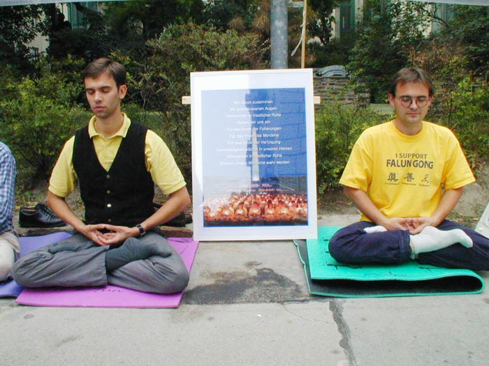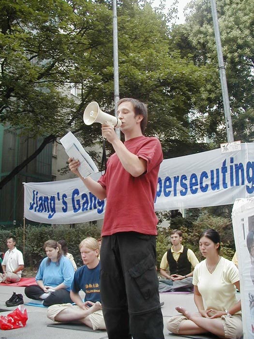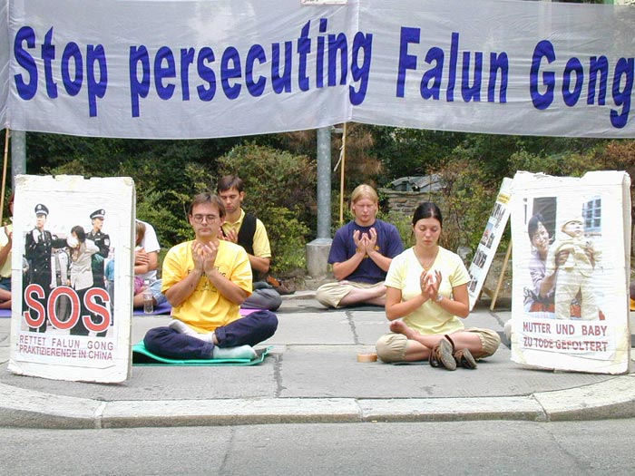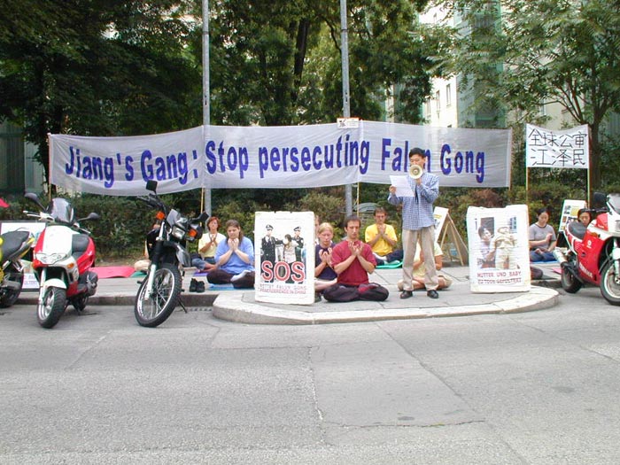 法轮功学员四年之际,奥地利法轮功学员在中国大使馆前集会,要求立即停止对法轮功学员惨无人道的镇压。集会中,学员代表宣读了一封写给中国大使馆及中国政府的信。