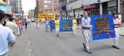 【明慧网2003年7月14日】“信仰自由、天赋人权”- 七月十二日中午,法轮功学员打着醒目的标语在纽约唐人街举行盛大游行。醒狮开路,一路锣鼓喧天,喜气洋洋,三百多人的队伍浩浩荡荡,集传统修炼和中华文化于一体,成为今夏的一大亮点。法轮功学员为了庆祝美国公正、自由的建国精神,感谢美国政府和人们对于自由、信仰的支持,在纽约唐人街举办盛大游行表示谢意。同时,法轮功学员想告诉世人,一个人对于正念正信的追求是任何强权、恐怖都无法磨灭的;只要迫害一天不停止,法轮功自始至终对于信仰的和平抗争就会持续下去。
