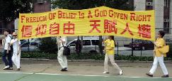 法轮功学员的游行就象他们四年来为了争取信仰自由的天赋人权一样,一如既往地和平祥和、慈悲坚韧、光明坦荡。这次游行所体现的的美国自由公正的建国精神也与江氏集团及被其利诱收买的帮凶在美国煽动仇恨与迫害的阴暗心理形成了鲜明的对比。