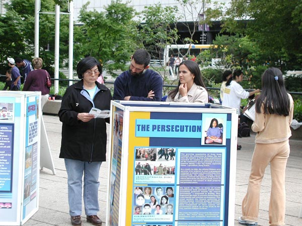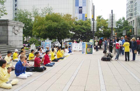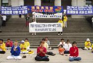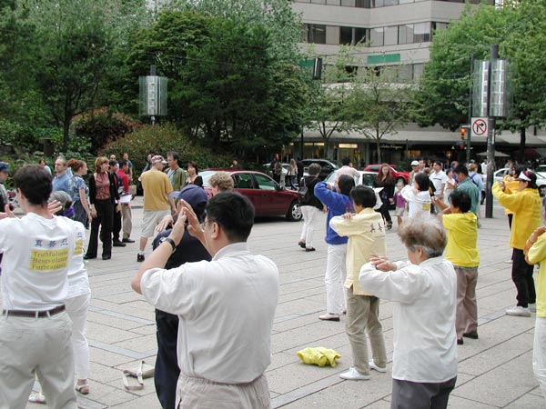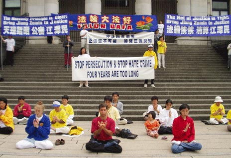 7月13日,在市中心艺术馆前举行了大型活动,学员有的举标语,有的发传单、讲真象、征签,大部分学员炼功,隔一段时间,交换位置,始终保持一直有学员在炼功。连续4个小时的活动,学员们一直保持着非常好的状态和形象,向世人展示了大法的美好。