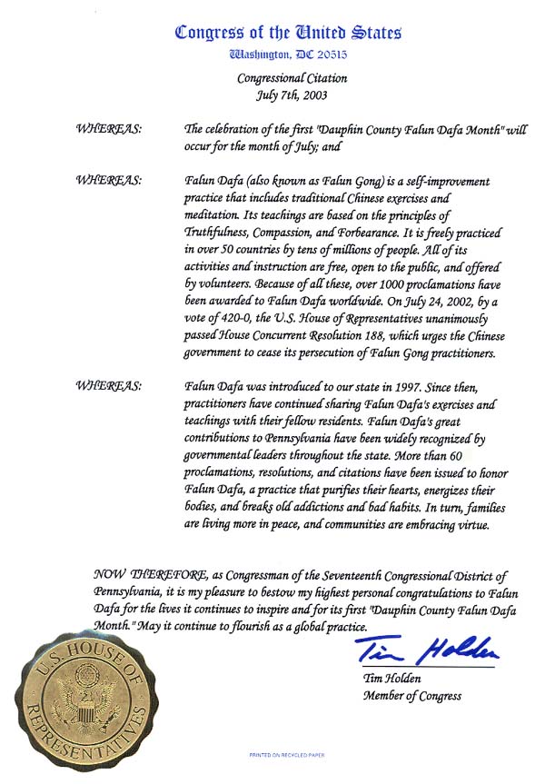 因此,作为宾西法尼亚州国会第17选区的国会议员,我荣幸地对法轮大法持续对生命的启迪以及首届“道芬县法轮大法月”表达我个人的最热烈祝贺。祝愿法轮大法继续在全球蓬勃发展。