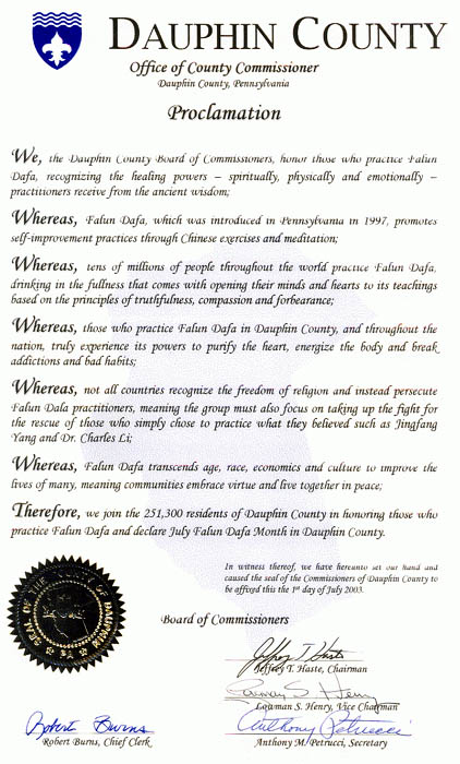 鉴此,我们与二十五万一千三百名道芬县居民一道,褒奖那些修炼法轮大法的人们,并宣布七月为道芬县法轮大法月。