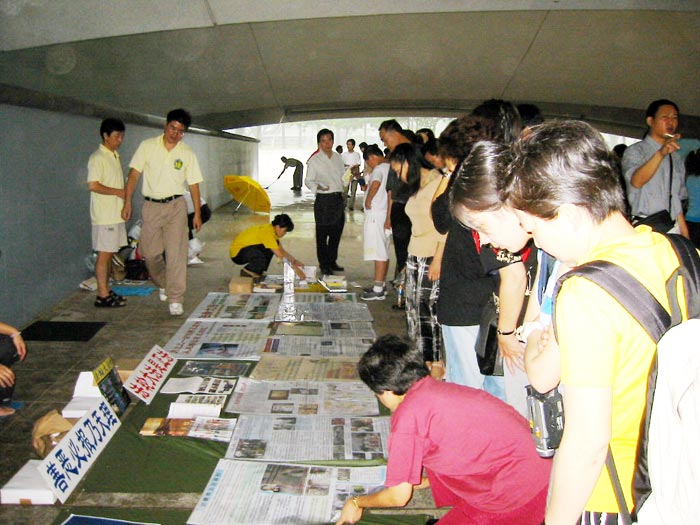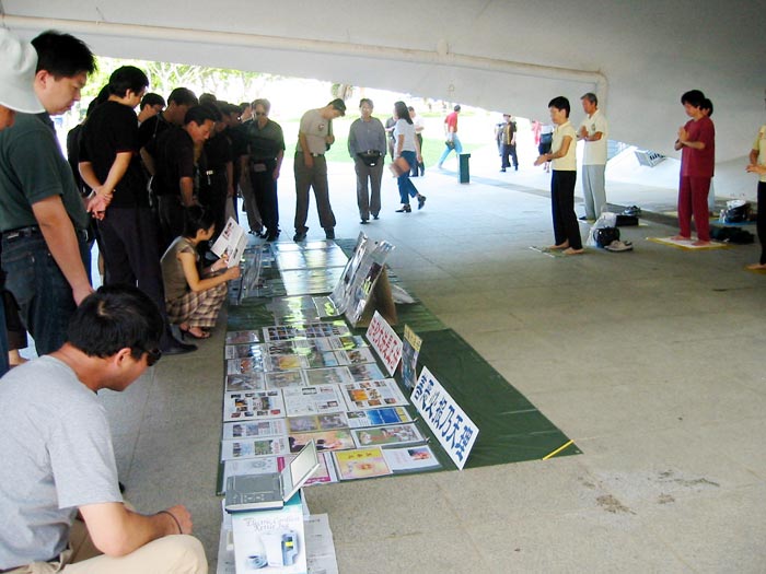 | 过往群众观看展板 | 到天安门请愿被捕的西人弟子上庭作证 |