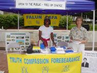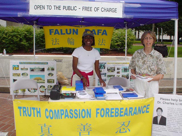 【明慧网2003年7月21日】7月20日,Blues Festival 音乐节在纽约州州府奥尔巴尼举办,法轮功学员也应邀来此参加活动,让这里的居民欣赏音乐的同时,也有机会了解一下除了他们已经熟悉的太极,法轮功是一种怎样的气功。音乐节是在帝国广场喷水池四周的空场地举行。参加音乐节的人挺多,不时有人驻足于法轮功学员的展台,观看功法演示,一位美国老年人坐下来看完电视介绍片之后,马上决定学功,并花了一小时跟着法轮功学员学习功法。还有一对美国年轻人向一位现已退休的科学家法轮功学员习炼了几套功法,这位科学家当年因为肾病被医生诊断来日不多,炼了法轮功后,几年过去却越活越健康了,他也愿意把自己的故事分享给大家。