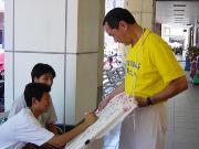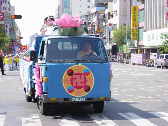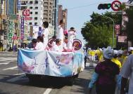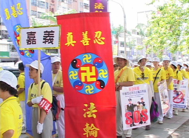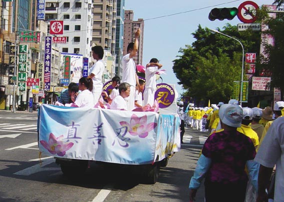 之后,大法弟子们精神抖擞地出发游行。此次游行的路线安排得很好,行经高雄市五大百货公司人潮众多的地方,各地区学员分别穿着”公审江泽民”、”迫害事例”及”法轮大法好”的背心,手拿着各式活动布条进行游行,扶老携幼、祥和壮观的场面令高雄市民印象深刻。