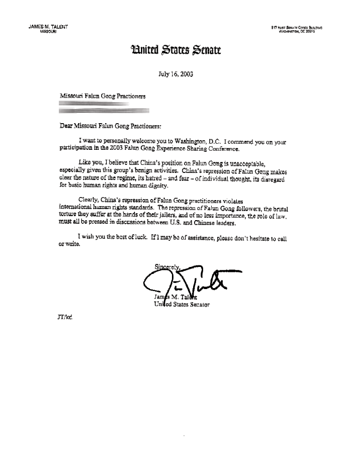 【明慧网2003年7月26日】2003年7月22日,来自全球的五千多位法轮功学员聚集在华盛顿DC的国会山下,举行和平抗议集会。美国密苏里州联邦参议员吉姆-泰伦在致集会的信中指出,中共镇压法轮功证实了其政权的本质 -对于个人思想的仇恨与恐惧,亦证实了中共政权罔顾其人民的基本人权与人类尊严。 信件中文译本如下:2003年7月16日