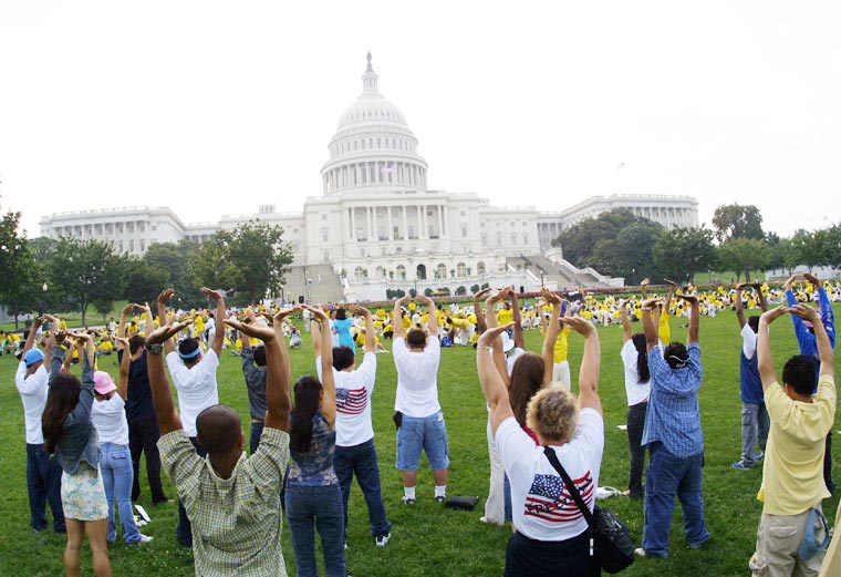 过路的游客学习法轮功五套功法之一:佛展千手法