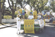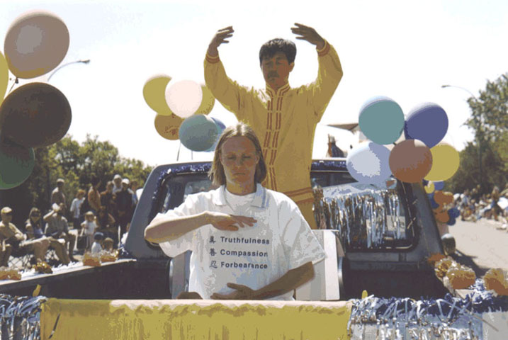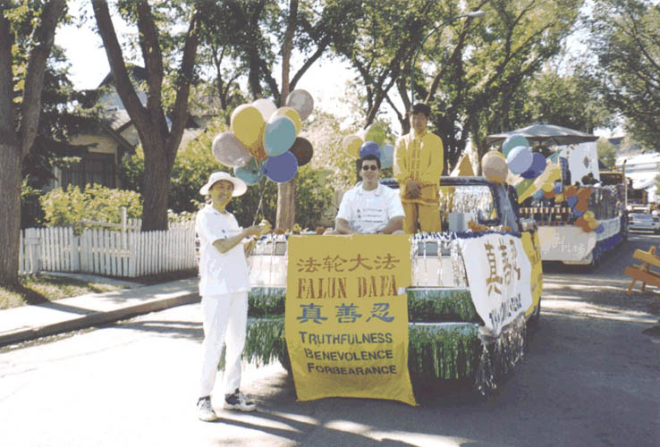【明慧网2003年7月29日】七月二十六日星期六上午,加拿大萨省里贾纳大法弟子参加每年一度的水牛节大游行,受到市民欢迎。水牛节是本地区最大的民间活动,有九十多家民间团体参加本活动,吸引了数万市民在路边观看,各大媒体进行几天的转播及评比。这是里贾纳大法弟子第四次参加本地区大型民间游行活动。