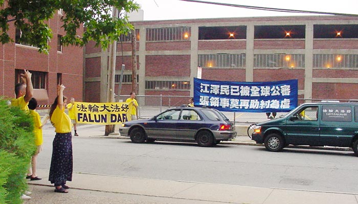 当日,在中华公所外,麻省理工学院宿舍楼外法轮功学员在路边默默地举着各色横幅和标牌。其中有「江泽民已被全球公审 张领事莫再助纣为虐」的一条巨大横幅立在宿舍楼正门入口处。周围有「停止迫害」、「天安门自焚是骗局」等诉求的展板,并播放了中英文录像片。法轮功学员人群中有老人、孩子,也有科技人士,期间有散发资料,有和出入告别会的社区人士交谈。整晚场外平静有序。