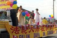 受到观众特别赞赏的队伍是大法学员的阵列,这也是本次游行中人数最多的一个阵列,大法学员的队伍装扮得非常漂亮。前面是一辆大花车,上面坐着多位身着各式唐朝服饰的女子,在悠扬的音乐声中打坐。花车后面紧跟着穿各民族服装的女子,有朝鲜服装,越南服装,印度服装等,后面还有着台湾山地服的女子在跳山地舞,令人有耳目一新之感。随后还有优美的缎带舞阵列,穿着印有“真,善,忍”字样法轮功服装的阵列及穿着漂亮便服的法轮功学员。学员们个个面带微笑,友善地向两侧观众挥手及问候。“加拿大日快乐”的声音此起彼伏。一位西人法轮功学员在队伍边上维持秩序,他那明朗的笑容令人群感到十分亲切。游行经过之处,观众的欢呼声,笑声不断,有的印度观众向队伍合十致意,还有的华人观众激动地大声说“法轮大法好!”一位法轮功学员介绍说:“今天来参加游行的学员有花甲的老人,推婴儿车的母亲,也有学员的家属前来支持,对此次游行我们准备得很精心,我们非常高兴地和大家一起共庆加拿大国庆,同时也向各界展示法轮大法的美好,希望将祥和及喜悦与每个人分享!”