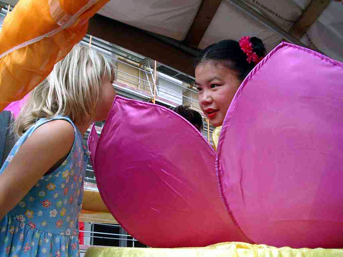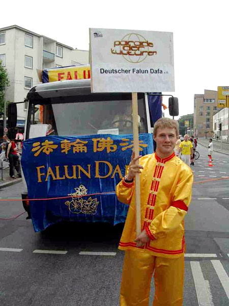 参加文化节游行的有约六十个团体,其中之一是一队由德国人和中国人组成的以“中国的文化与修炼”为主题的法轮功修炼者。几个穿着华贵的金黄色中国传统服装的法轮功学员在一辆装饰着中国风景画的彩车上展示功法。美妙的音乐响起,女学员们随之翩翩起舞,一切都是那么和谐。她们身着传统的中国服装,表演几千年来在中国深受喜爱的民间节日庆典舞蹈──扇子舞、姿态各异、美不胜收。不断有孩子拉着父母来看我们的游行。孩子的父母不解地问,为什么法轮功在中国遭到镇压?