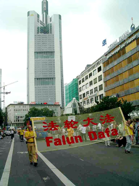 【明慧网2003年7月4日】六月二十八日,法轮功学员参加了法兰克福首届国际文化节游行。游行中的七十多名法轮功学员赢来了阵阵掌声,路边的中国人感到震惊。他们清楚地看到,眼前的这情景和中国政府四年来对法轮功学员的残酷镇压以及它向全世界散布的谎言有多大的反差。