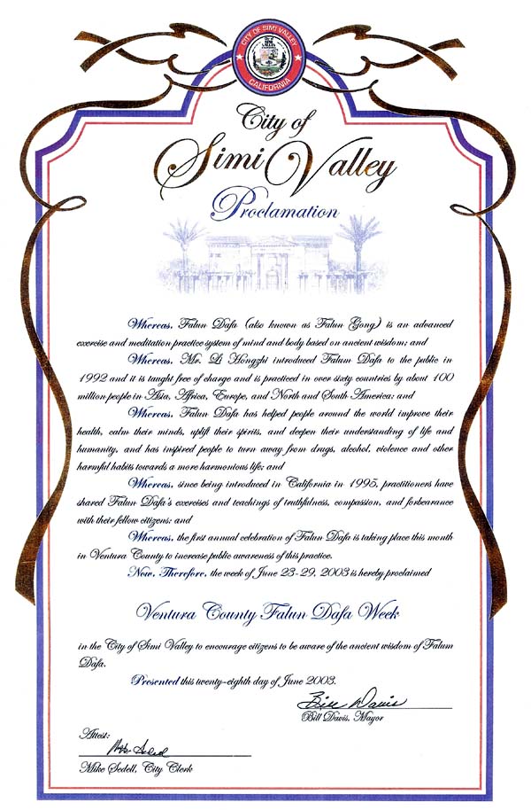鉴于,文图拉县首届法轮大法庆祝活动于本月举行,以增加公众对法轮大法修炼的认识。