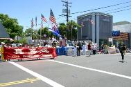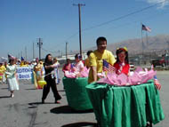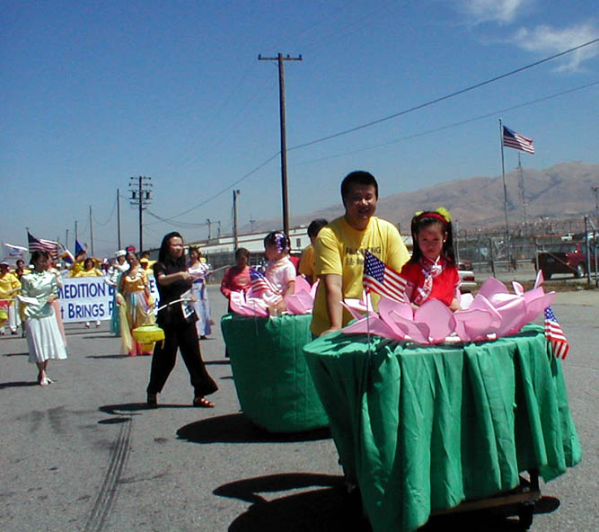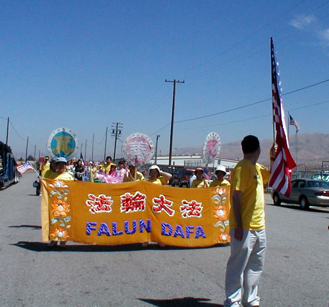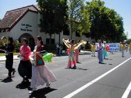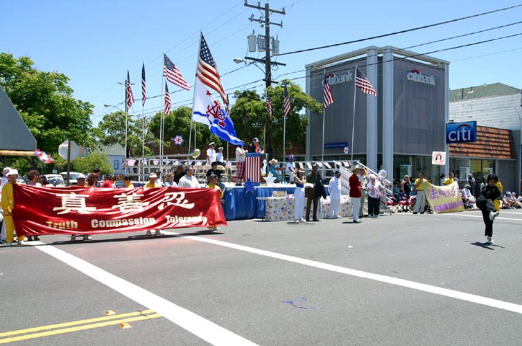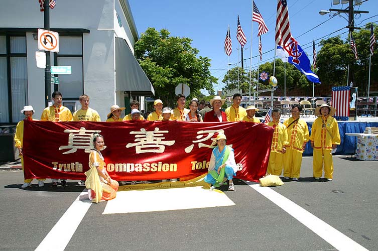 部份湾区法轮功学员参加了加州湾区阿拉米达(Alameda)市举行了传统的每年一次的独立日游行。7月4日上午9点钟,在游行开始前两小时,学员们就已在游行的出发点列队排练了。游行于十一点开始,一百五十个不同团体身着各式服装的队伍走在一起,附近的居民很多都全家一起在路边观看游行队伍。