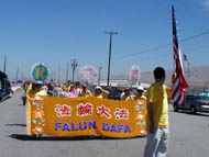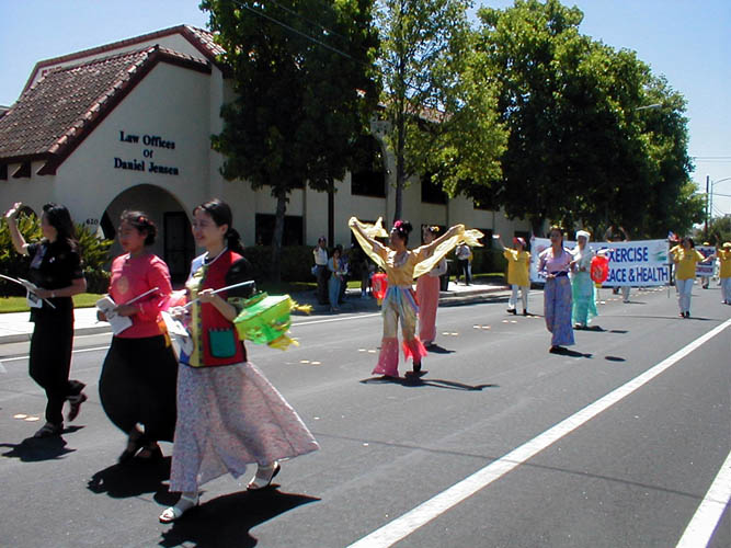 来自苗必达、圣荷西等城市的大法学员们来到了苗必达(Milpitas)市参加游行。当游行队伍经过主席台时,市长热情地向学员们挥手,并向观众介绍法轮大法。并看着我们的横幅上的字大声说出“修炼带来和平和健康。”