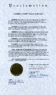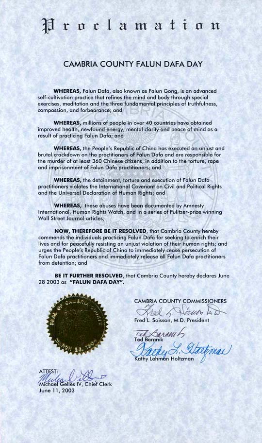 进一步决定,坎布里亚县(Cambria County)在此宣布2003年6月29日为“法轮大法日”。