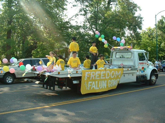 当天天气清爽,阳光明媚。游行的学员们来自附近的哥伦比亚市和圣路易市,游行时学员们有的在花车上炼功,有的在花车周围发资料,配合得井然有序。花车所到之处,热情洋溢的市民们有的给予热烈的掌声,有的向我们频频挥手示意。很多人高兴地接过了我们的资料。