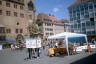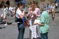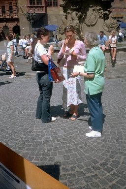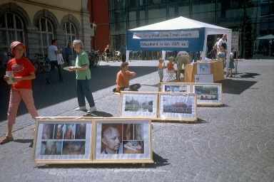 星期六,在维尔斯堡市(Wuerzburg)举办了又一个关于紧急救援受的法轮功学员和江××在美国被起诉的信息日。人们从横幅上的大写字上可以了解到江××因群体灭绝罪被起诉。有的行人还给横幅照了相。许多从我们这儿走过的市民过来在呼吁书上签名。有的直接过来没有问就自愿签名。
