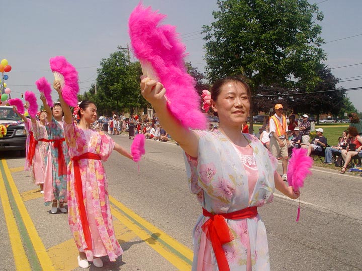 【明慧网2003年7月9日】今年是俄亥俄州建州200周年,各地都在国庆节期间举办了规模盛大的庆祝游行。俄亥俄州的法轮功学员分别于7月3日和4日参加了首府哥伦布市(Columbus))和都柏林市(Dublin)的庆祝游行。法轮功学员是所有参加团体中唯一的以亚裔为主的社团,他们将法轮功功法和自编的扇子舞展示给了俄亥俄人民和当地的华人。