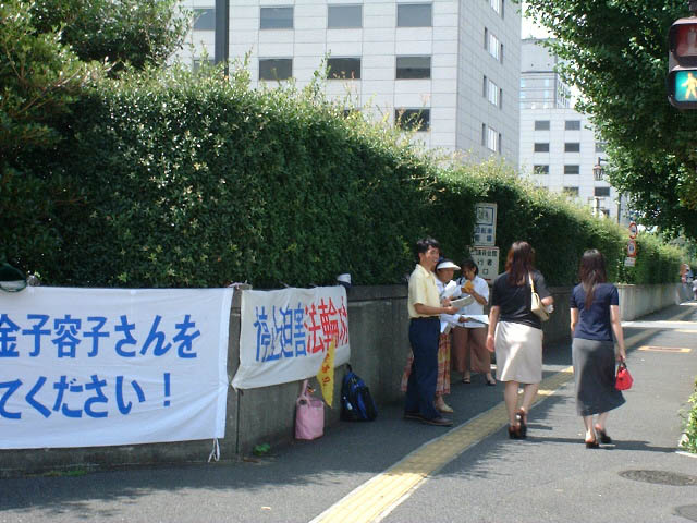 当李氏与川口外相在外务省会谈时,大楼外面站立着大法弟子打横幅、发正念;当他到首相官邸见小泉首相时,大法弟子在首相官邸前他的车队的必经之处举着大横幅 “停止镇压法轮功”和“立即释放金子容子”;当记者招待会在日本记者俱乐部召开,中国、日本和世界各大媒体汇集而来时,不少大法弟子也赶到那里;在新大谷饭店,在去箱根沿途,……到处都是大法弟子的“停止迫害”的醒目横幅和正义呼声。