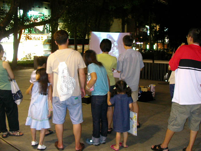 第二周(8月2日)周末,早到场地的同修,虽然没有经验,却也迅速地分成两小组,一组负责架设播放影片的布幕,一组则开始准备投影机。当天的活动进行分成集体炼功与播放影片。虽然活动的同时,在圆环的正中央有个热门乐团正举行着演唱会。可是原本喧闹的音乐声,在同修们集体炼功、与播放真象影片的同时,好像不存在似的,顿时停格失声。祥和的炼功音乐淹盖了原本声声震耳的流行音乐,路过的民众,不时放慢脚步,驻足观看同修们集体炼功;也有的民众停下脚步观看影片,好像流行音乐突然消失了似的。