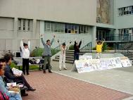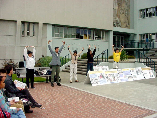 | 在加州新月市接受The Daily Triplicate日报的采访 | 在加州尤瑞加法院前炼功 |