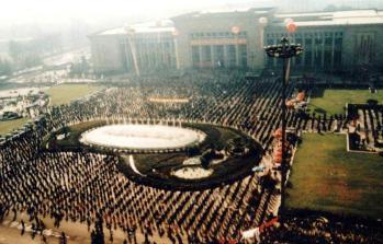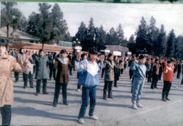 青年学员在华北烈士陵园门口广场炼功