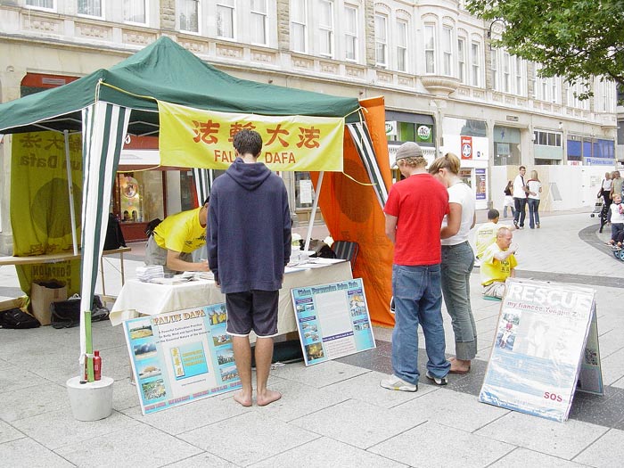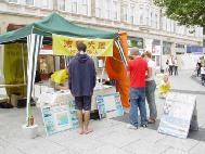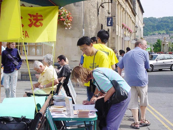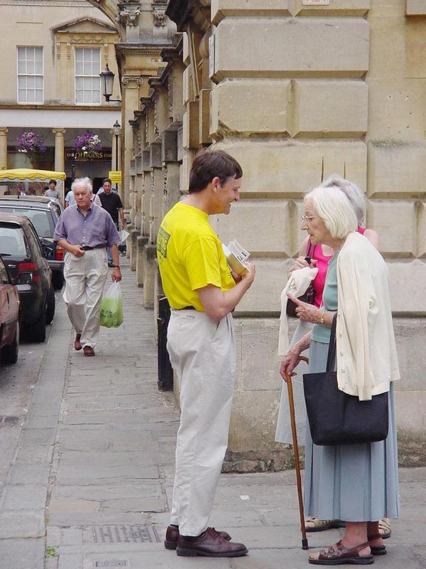 两位同修所居住的城市是西部地区的一座省会城市,大白天,街道口人来人往,非常密集。人群中,同修大姐问身旁的同修小妹:“某阿姨最近怎么样啊?”“她呀,炼法轮功,被关进劳教所……。”两同修一边走,一边述说“某阿姨以前怎么样,修炼法轮功以后怎么样,如何被迫害。”一问一答。周围同路的行人也一边走,一边专注地听。在公共汽车上、餐馆里、商店里,二位同修走到那里,讲到那里。