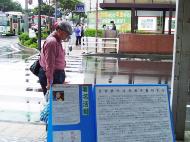 今天的天气虽然由阴转雨,行人还是比较多。许多人认真地看展板上的内容;许多人在专注地听我们的广播;来往的车辆在等待信号时,车里的人看到了展板上的内容,向学员招手索要资料;许多人接到资料后认真地阅读起来,有的人看过资料后主动要求签名,并对容子的情况表示关注。有的人签过名之后,还给学员提建议说,应该直接向日本政府呼吁,找辩护律师为容子辩护。有一辆车连续鸣笛,大家回头一看原来是来自新泻的出租车,车里的司机在向学员敬礼,学员忙鞠躬致意,看来这位来自容子家乡的司机知道容子的事。签名的人们有老人,主妇,小学生,背着孙子的奶奶;有的母女,还有的全家一起签名。但也有人由于听说过一些行骗的事,有些顾虑,经大家讲过真相后,也主动签了名。