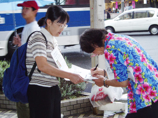 【明慧网2003年8月22日】8月17日金子容子救援会在福岛县的福岛市举行了呼吁尽快救出金子容子的签名活动。早上十点仙台、山形的学员和福岛市的学员一起在福岛车站附近的大百货商店前摆放了自己制作的展板,上面写有营救金子容子署名活动,金子容子的详细情况介绍以及江××在海外被起诉的情况等,并用录音机连续播放金子容子的情况及呼吁为救出容子希望人们协力签名。然后大家开始一边发资料,一边征集签名。