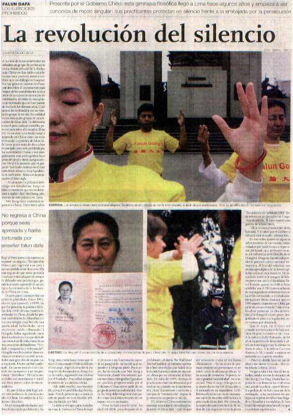7月16日《商报》头版发表一篇题为“无声的变革”(La revolución del silencio)介绍法轮功图文并茂的文章。这份喜闻乐见上至总统、议员、高官达贵,下至平民百姓,各阶层人士都看的《商报》,首次大篇幅刊登法轮功的真象文章,进入了秘鲁的千家万户;同时间也到了周边的南美洲其他国家。