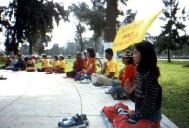 不一会,一辆小型货车停放在我们的不远处,下来一位拿着有标志话筒的小姐和一位扛着专业摄像机的先生,直奔我们这边来。这时下午四点整发正念的时间到了。电视台的采访者,目睹了这似乎能让整个空间凝固的安静,和平的场面。拍下了十五分钟发正念的镜头。可能受到这种场面的感染,采访小姐席地而坐与我们交谈并询问她所要采访的内容。西人学员翻开西文真象杂志上的图片讲述了中国法轮功学员被迫害的真象事实。采访小姐静静地听着、记着,摄影者不断地抓拍着杂志上的照片。一位西人学员翻开《见证》册子中“天安门自焚”的图片,向记者揭露了中国江氏流氓集团用各种卑鄙的政治手段迫害法轮功的罪行。他告诉记者目前江泽民正在因酷刑反人类罪及种族灭绝罪被多国法轮功学员起诉。记者听后,迫切地表示要了解更多的有关法轮功的情况,并要求我们当晚给他们送去有关的录像和相片。最后他告诉我们这次采访将在第二天的新闻节目中播放。