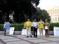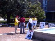 在学员摆放展板时,很多路人驻足观看、签名,并感谢学员的努力。一位50多岁的西方人说;“我正在写一本有关中国人权的书,将要完成。等完成出版后,我要将大部份的钱用于‘停止迫害’。” 另一位西方人则要将大法的网站链接放到自己的网站上,让更多的人了解迫害,了解大法。一位从大陆来的男士表示听说过李祥春的事。当他了解到学员所做的一切是为了呼唤‘正义良知’时,马上在签名簿上签名。