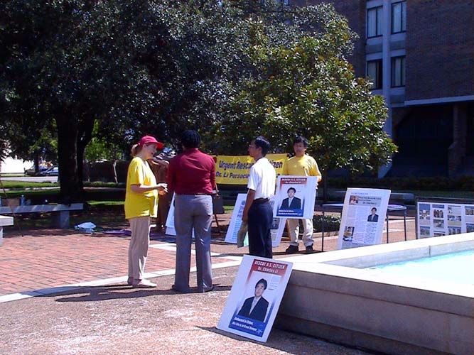 蒙缇高戈瑞市是阿拉巴马州的首府所在地。今天的新闻发布会得到了亚特兰大和伯明翰市学员的支持,他们开车长途跋涉赶来支援。我们在蒙缇高戈瑞市政府楼街对面的小公园摆好了横幅和展板。当地最大的报纸Montgomery Advertizer派记者来采访。在讲到美国公民查尔斯被中共抓捕并判刑时,学员们说独裁者江泽民为了维持对法轮功的迫害,从镇压的开始就制造了许多谎言来蒙蔽全中国和世界的人民。其中最为邪恶的就是制造“天安门自焚”事件来诬陷法轮功。虽然我们很多海外的人们都明白这是他们的谎言,但在中国大陆由于媒体都是被中共所控制,人们根本就不知道真实的情况,根本就不了解江XX正在用这么残酷的手段迫害信仰“真、善、忍”的百姓,查尔斯回中国就是想告诉中国人民真实的情况,不再受谎言的欺骗,以使得无辜的人们不再遭受这种痛苦。记者把学员讲的都记在她的记录本上了。