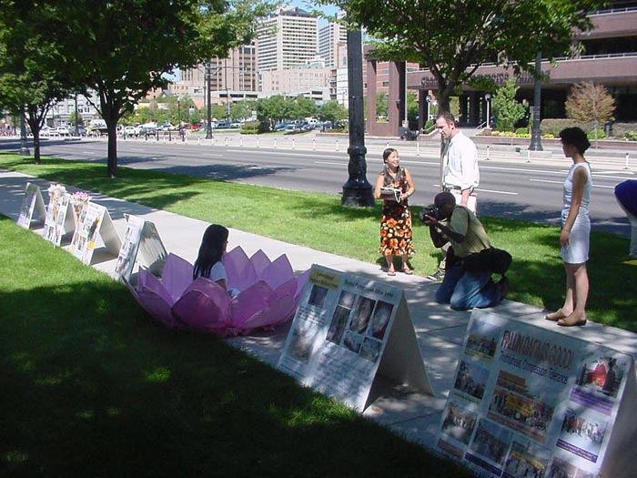 在盐湖城,沙漠新闻报(Desert News) 是当地主要媒体之一;记者刚开始对学员的到访不是太感兴趣。学员本着讲清真象、救度众生的心态,向这位记者讲述了美国公民在中国如何被非法关押和遭到残酷的迫害。学员并以在二战中犹太人遭到希特勒的迫害为例,讲述了在中国江XX对法轮功的迫害之残酷比起希特勒对犹太人的迫害是有过之而无不及。学员还告诉记者,汽车之旅就是要让更多的人了解这些事实,呼吁有善心和正义的人们一起营救美国公民和制止这场在中国的镇压。听到这里,记者深深地被感动了。他特意请来专业摄影师,为学员拍照,还表示:“谢谢你们的努力。我们每个人都应该为这事努力。”随后这两位记者和摄影师在他们的日程已经排得很满的情况下,继续跟着学员,还拍了很多学员炼功的的照片。最后在营救李祥春的签名板上签了名才离去。